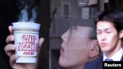 그럼, 뚜껑을 제거하세요. 잘 저어서 컵에 있는 라면을 드세요.