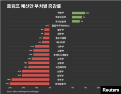 반면 환경청 예산은 31%, 대외 원조 등을 담당하는 국무부는 29%, 농업부와 노동부는 예산이 21%가량 크게 삭감됐습니다.